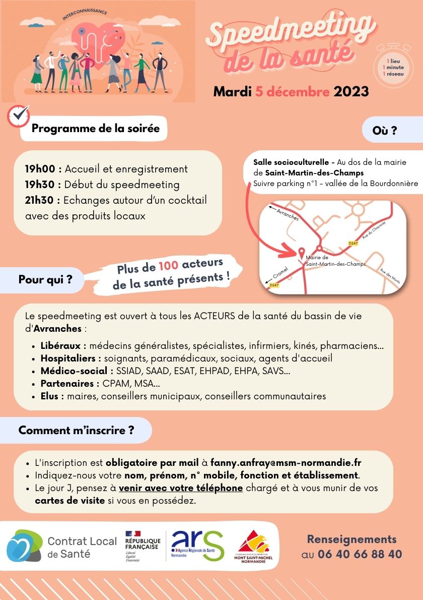 Vous êtes acteur de la santé du bassin de vie d’Avranches et souhaitez prendre le temps de rencontrer et d’échanger avec vos pairs autour d’un concept innovant ? Participez au speedmeeting de la santé qui aura lieu le mardi 5 décembre prochain.